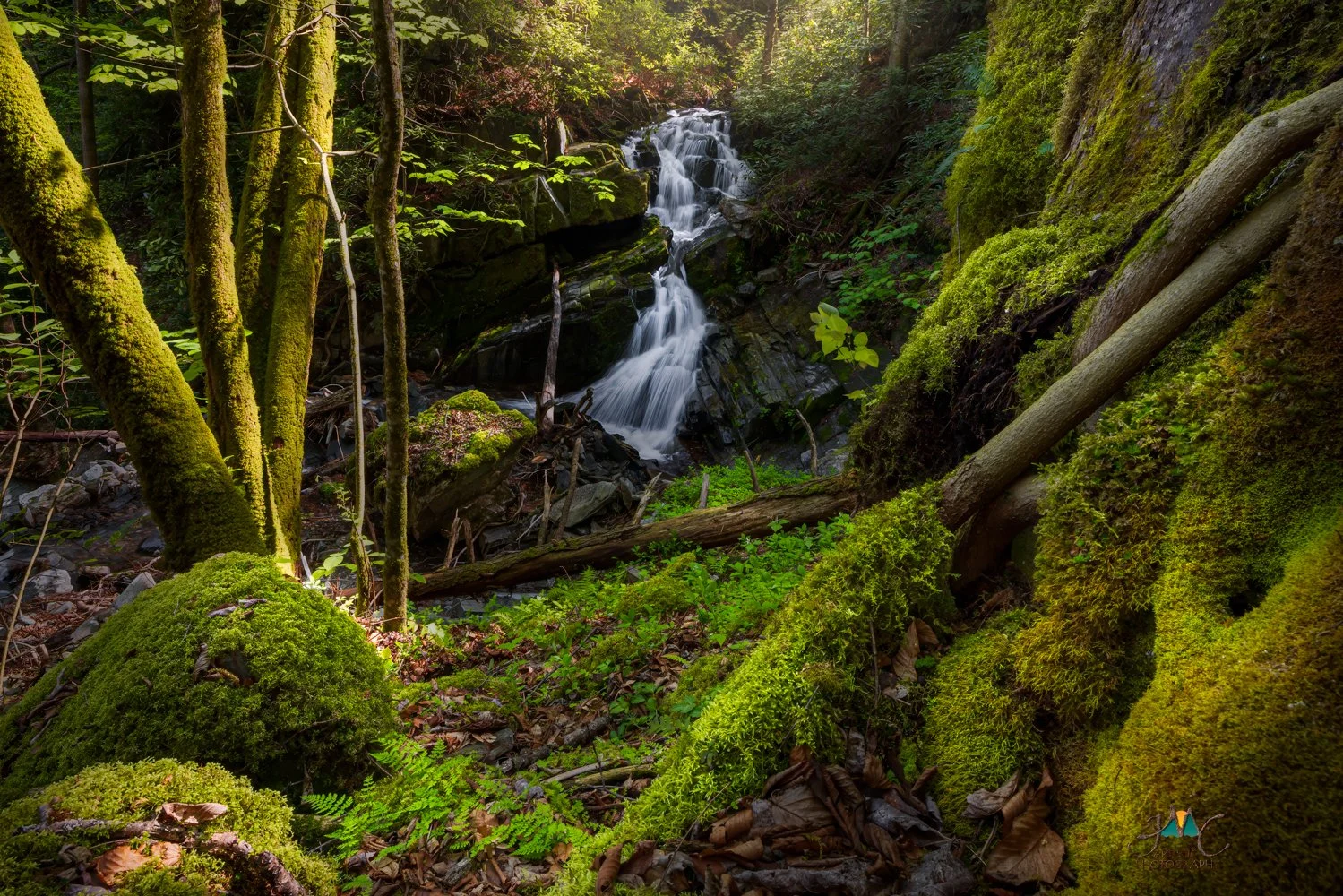 After this image is when this peaceful little journey into the smokies turned a little dicey! This fall is what they call “bluffed in”. It was very steep on the sides to get past this fall. Hillbilly and Heidi said there was another beautiful fall just above it. The only issue is crawling up the side of this bluff! Again, I have this 35lb backpack with a tripod that wants to grab everything which was not ideal in this situation to say the least. So we headed up this ledge grabbing on roots and kicking holes into the ground for some leverage. All four of us made it up safely and we got to this other fall which had even more moss! It was so thick you could literally headbutt the rocks and be totally fine! I didn’t try it so don’t hold me to it!:) The sun was up a little more so I placed it just behind a tree to create a nice little sun star. So I had the nice light beaming down the creek and hitting some of the moss and the old growth trees in front of me to make such a nice photo. I called this one “Sunkissed”
